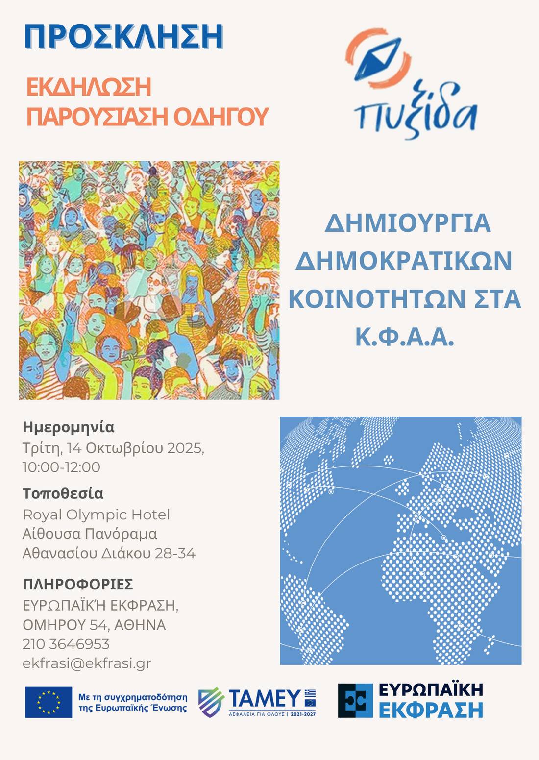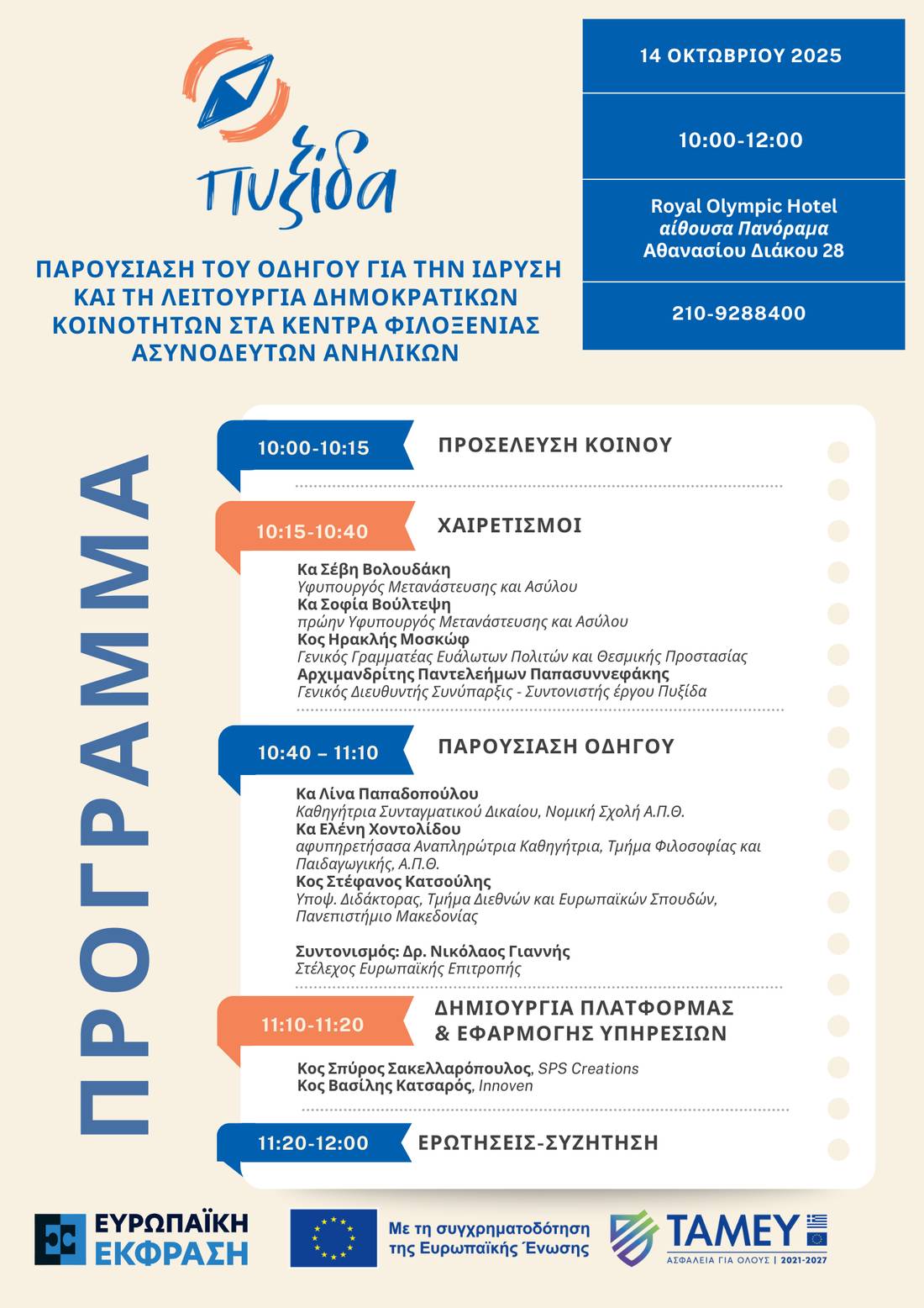 Η Ευρωπαϊκή Έκφραση ως εταίρος του Προγράμματος Πυξίδα "Συμπληρωματικός Μηχανισμός Υποστήριξης της Εθνικής Στρατηγικής για την Προστασία των Ασυνόδευτων Ανηλίκων στην Ελλάδα’’ διοργανώνει εκδήλωση για την Παρουσίαση του Οδηγού που αφορά την Ίδρυση και Λειτουργία των Δημοκρατικών Κοινοτήτων στα Κέντρα Φιλοξενίας Ασυνόδευτων Ανηλίκων.